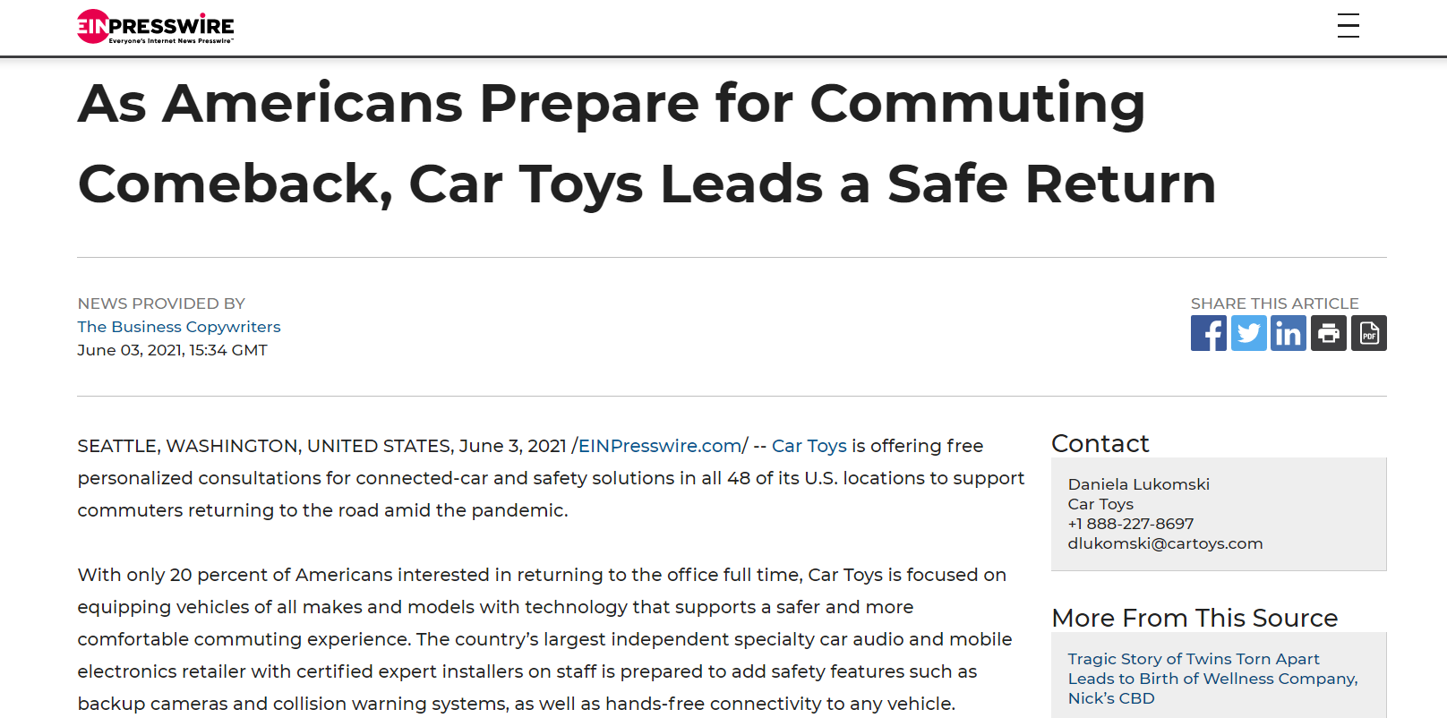 As the pandemic was (seemingly) winding down, Americans were hesitant about returning to the office full-time. I wrote a press release letting people know that no matter what you drive, Car Toys has everything you need for a safer and more comfortable commuting experience.